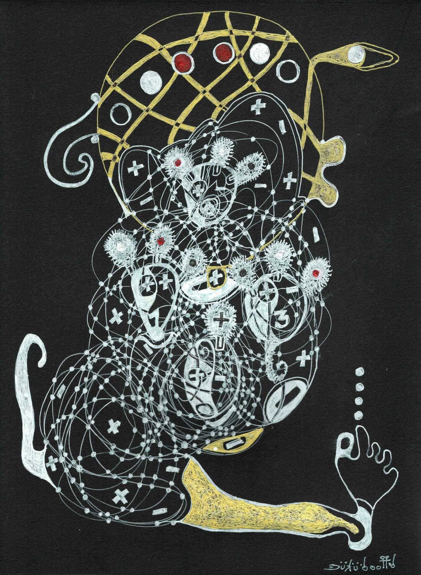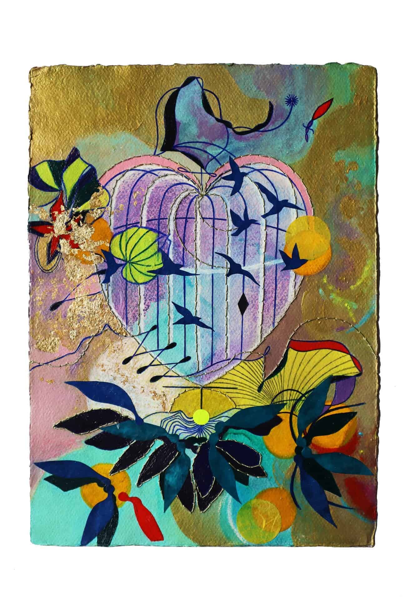 Nurtured by childhood memories, Tiffanie Delune's practice evolves towards a world of wanderlust and utopia, where dreamlike visions, reminiscences of travel, symbols of femininity and spirituality all come together. Exploring the psyche and the spectrum of human emotions, she celebrates the magic of storytelling as a vehicle for dialogue, introspection and sharing. Driven by an intuitive and spontaneous curiosity, she creates works on Indian cotton paper using mixed media (acrylic, aerosol, oil pastels, glitter, weaving...), freely choosing her materials for their texture and symbolic significance. In a world riven by oppositions, she weaves a poetic, mixed-race narrative, imbued with plurality and multiple influences.