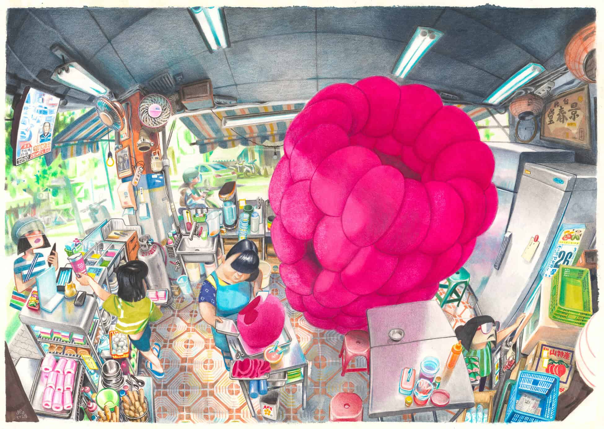 Florent Chavouet likes to go back to the photos and sketchbooks of his past travels. He navigates through his memories, appealing more to sensory memory than to sharp, precise observation. The result is a play of murky reflections, vaporous atmospheres and drawings that reveal themselves in chiaroscuro. He varies the seasons and the light according to his inspiration. In this series of drawings, it's no longer a question of going out to meet the other, who is often absent or whose presence is reduced to a more or less diffuse silhouette. Florent Chavouet seems to turn his gaze inward, focusing on impressions and recreating horizons and streets that now exist only in his memory.