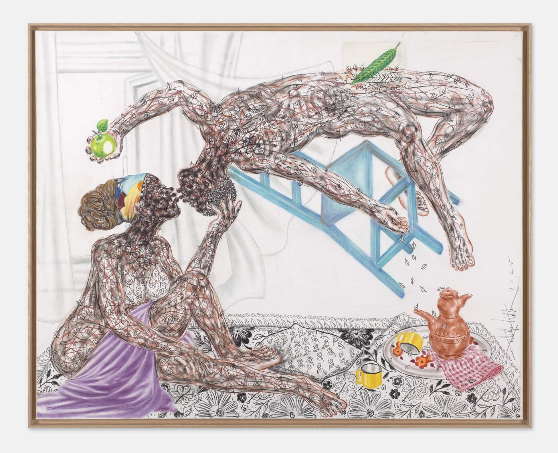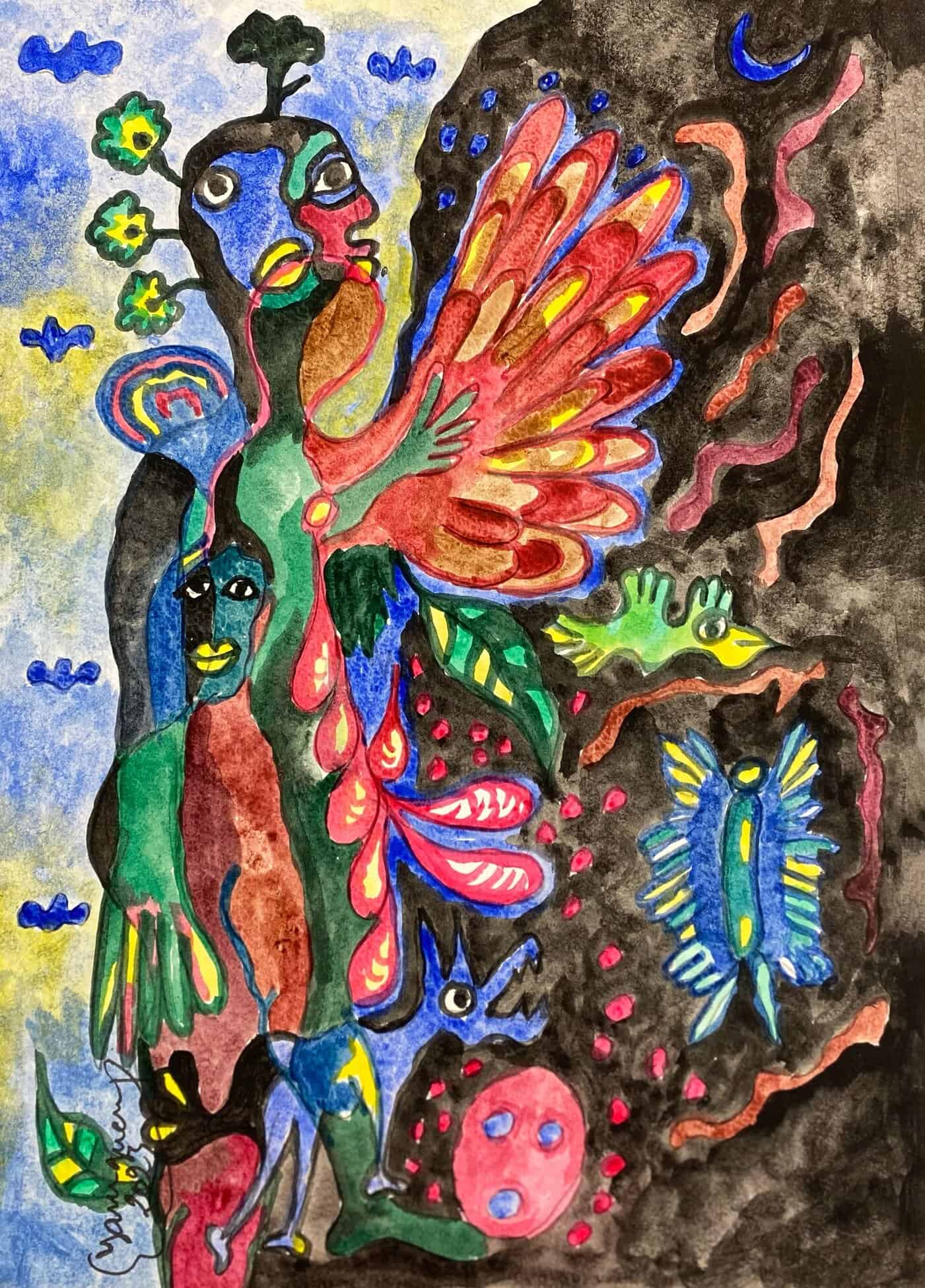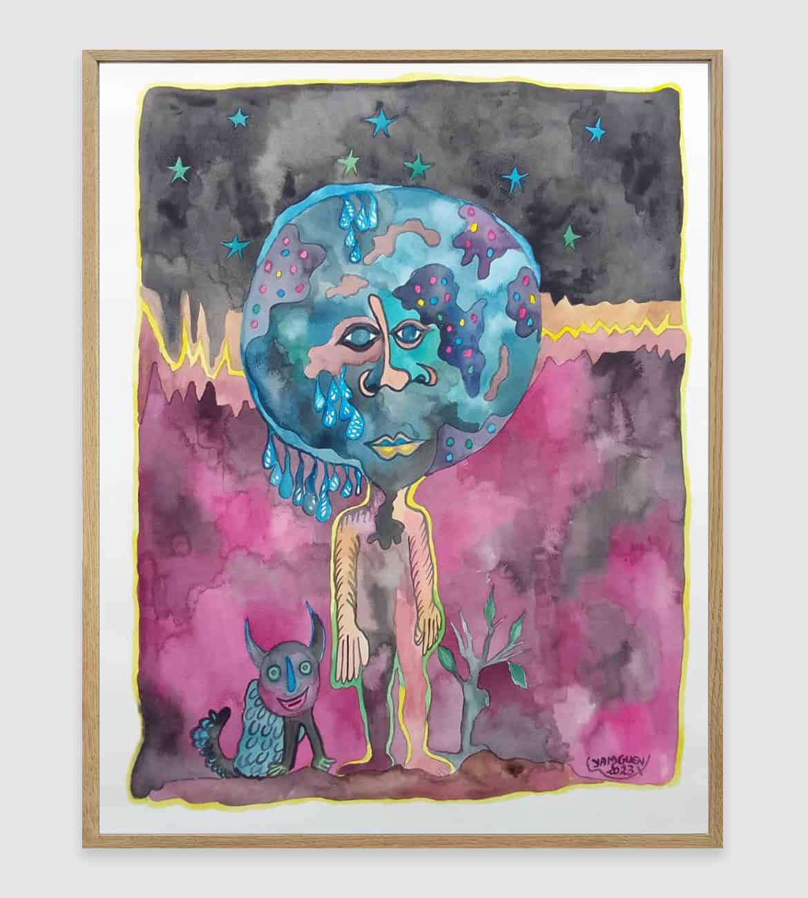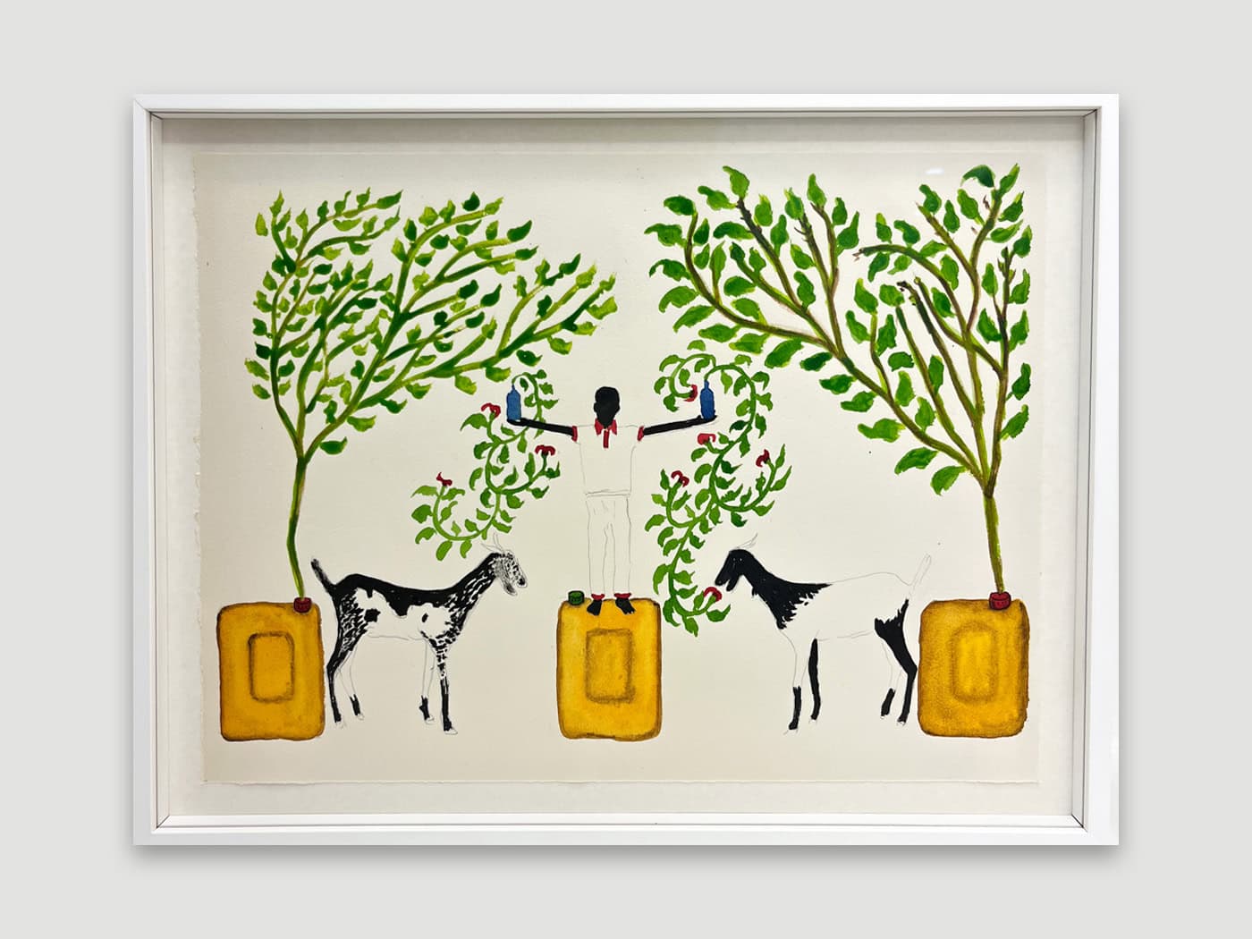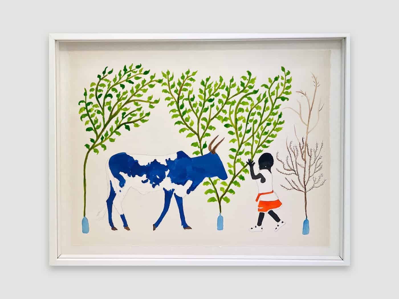 Saïdou Dicko’s watercolours echo the artist’s universe, inhabited by children, animals, and imaginary flowers nourished by plastic waste. The figures at the centre of the blank page are left to their own devices. The stories they tell beneath the mango tree reflect their dreams and hopes. Together, they naïvely imitate adults, creating a parallel reality where everything becomes a source of wonder. It is up to them to imagine what tomorrow might hold. Far from natural disasters, human beings and nature live in harmony. Saïdou Dicko sketches an invitation to kindness and to reconnect with our environment. Plastic - the nerve centre of today’s ecological battle, here sustains a reborn nature and thus becomes a source of life.