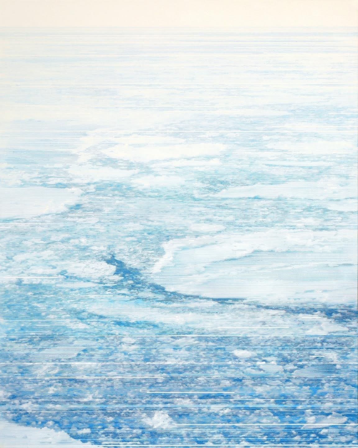 Inspirée par les paysages nordiques, ses compositions évoquent la glace morcelée du Saint-Laurent ou les vagues de Terre-Neuve, symboles fragiles de la crise climatique. Les lignes mécaniques et les glitchs technologiques, contrastant avec la délicatesse du dessin, traduisent une réflexion poétique et critique sur notre rapport technologique au monde et à l’environnement.
