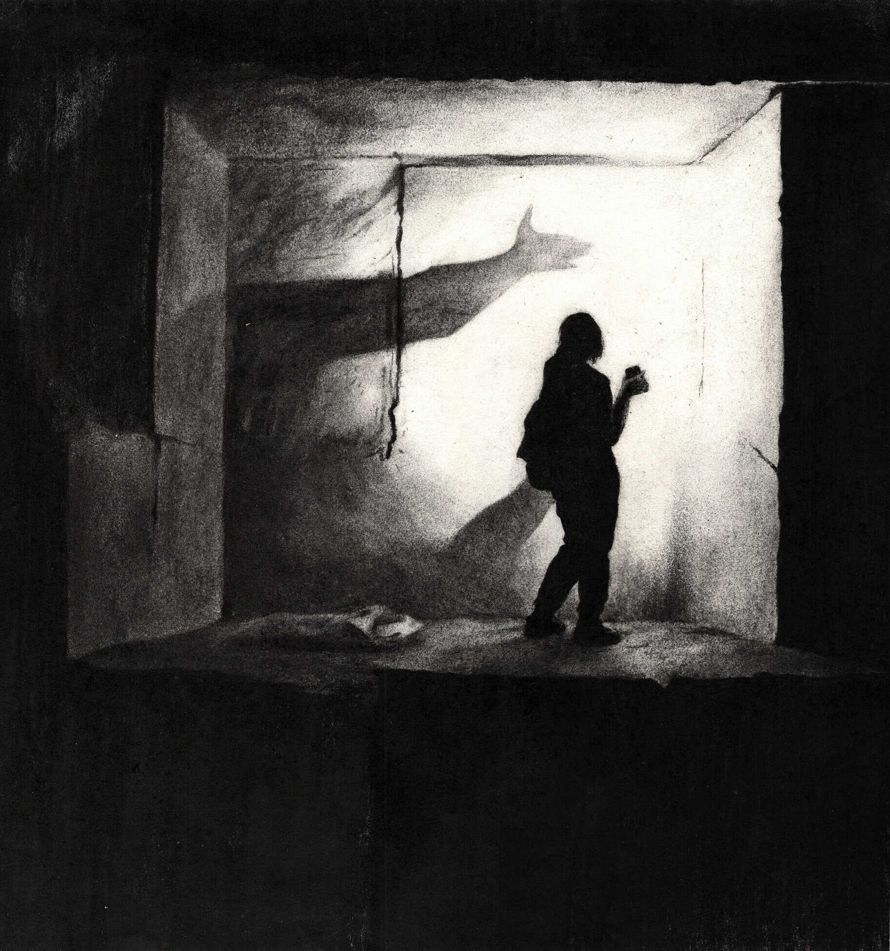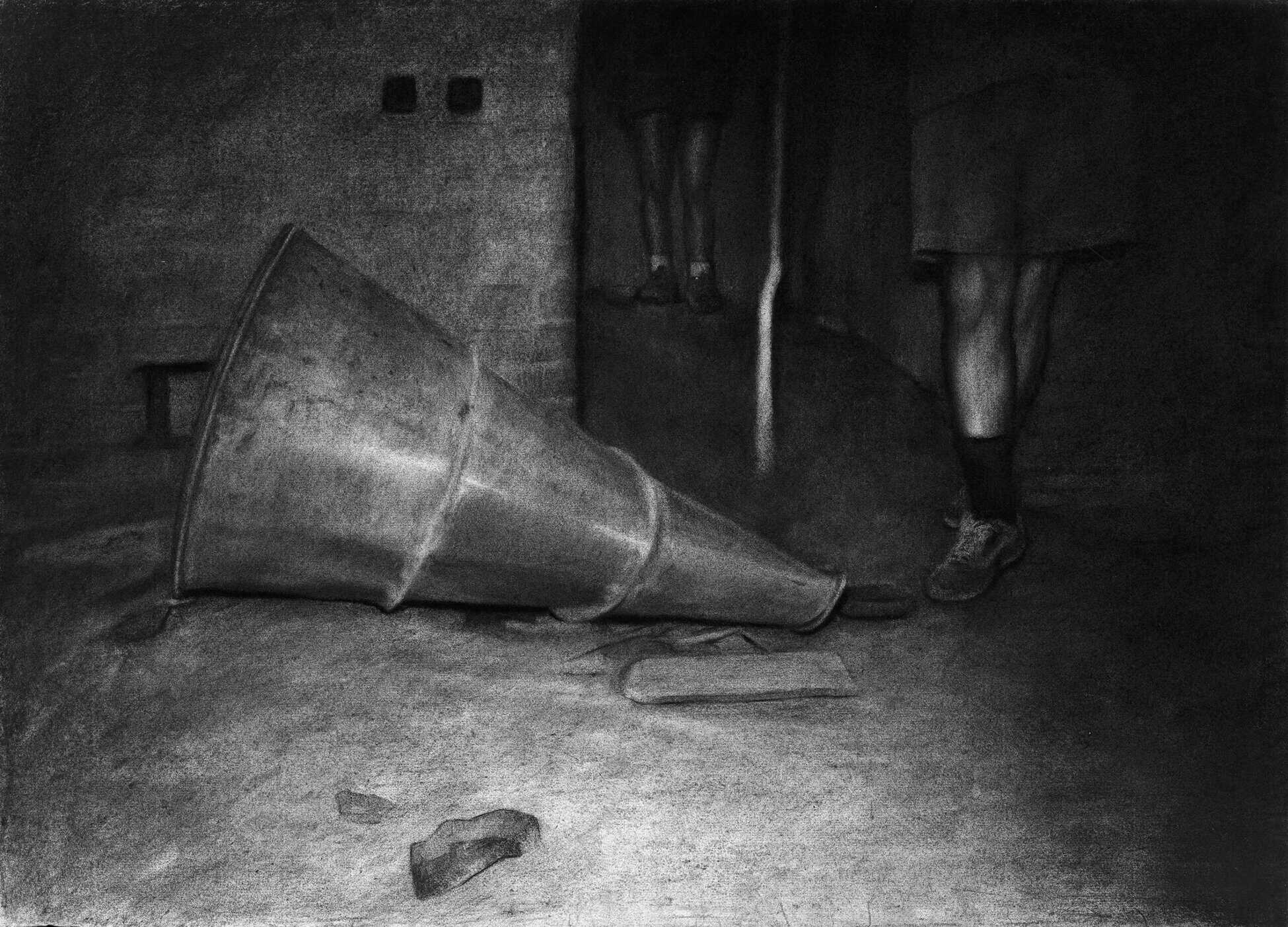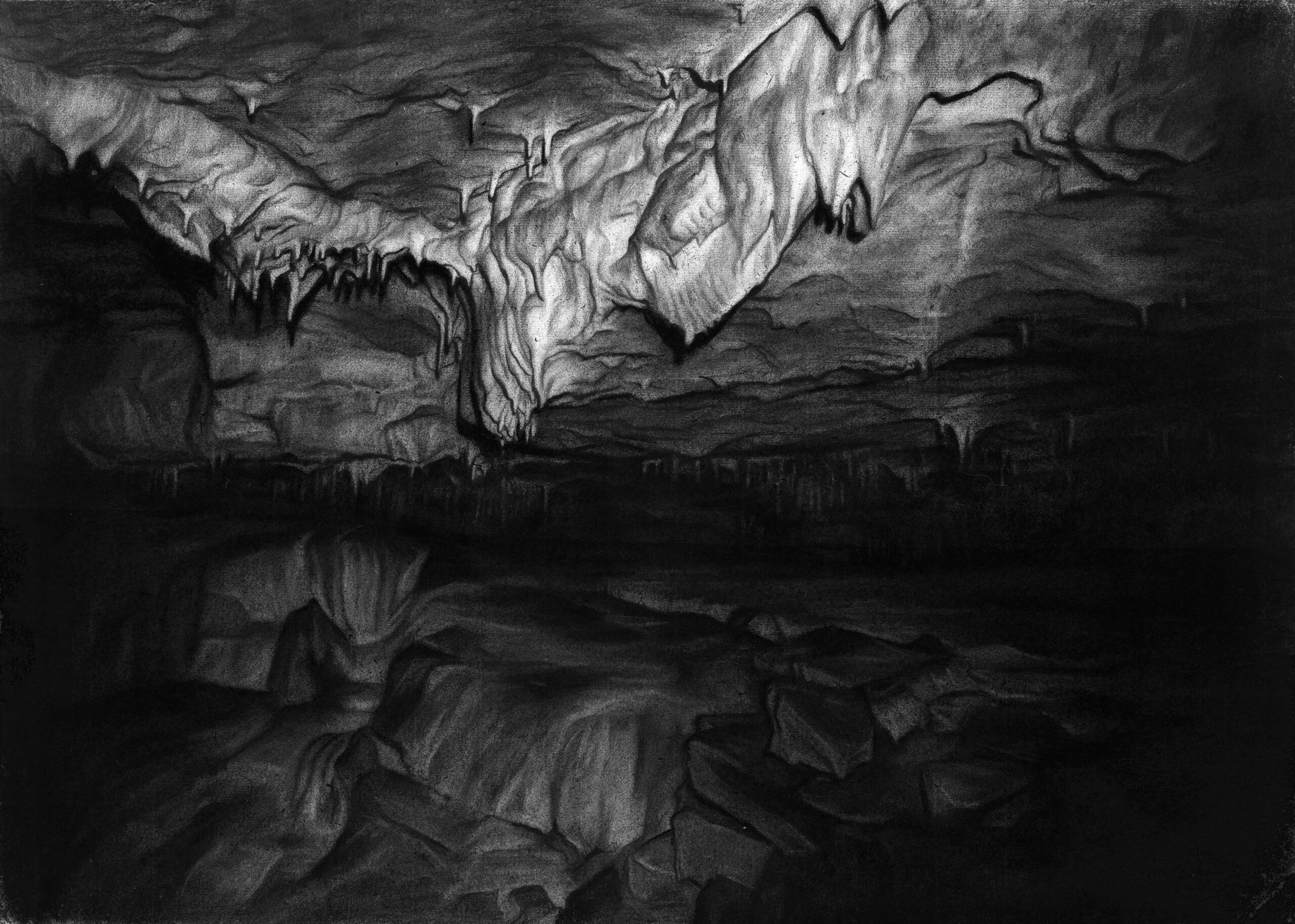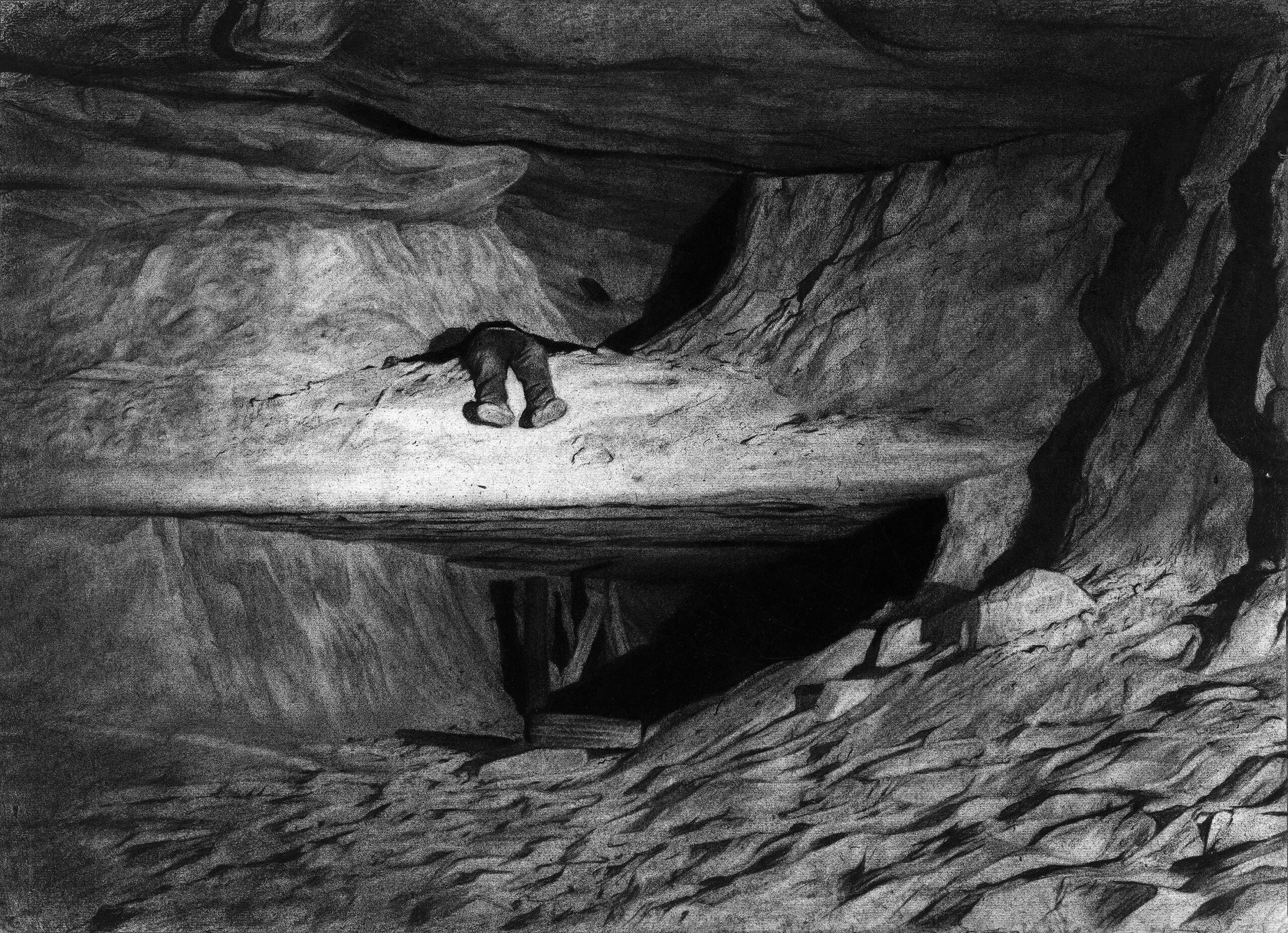 Amélie Royer relate dans ses dessins une déambulation silencieuse, à travers des paysages souterrains, grottes et cavités photographiées lors de ses explorations spéléologiques. Echo du malaise d’une jeunesse en quête de refuges à la marge, son travail en restitue des espaces de liberté, une réalité parallèle où l’on peut respirer, se reposer, maître de son temps. Dans cette obscurité totale, la lumière creuse la matière du noir et incarne une présence presque mystique.