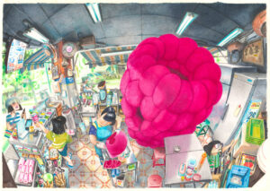 Florent Chavouet aime se replonger dans les photos ou les carnets de croquis de ses voyages passés. Il navigue dans ses souvenirs, fait appel à la mémoire sensorielle plus qu’à une observation nette et précise. Il en résulte des jeux de reflets troubles, des atmosphères vaporeuses, des dessins qui se révèlent dans un clair-obscur. Il fait varier les saisons et la lumière selon son inspiration. Dans cette série de dessins, il ne s’agit plus d’aller à la rencontre de l’autre, souvent absent ou dont la présence est réduite à une silhouette plus ou moins diffuse. Florent Chavouet semble tourner son regard vers l’intérieur pour se focaliser sur des impressions et recréer des horizons, des rues qui n’existent plus que dans son souvenir.