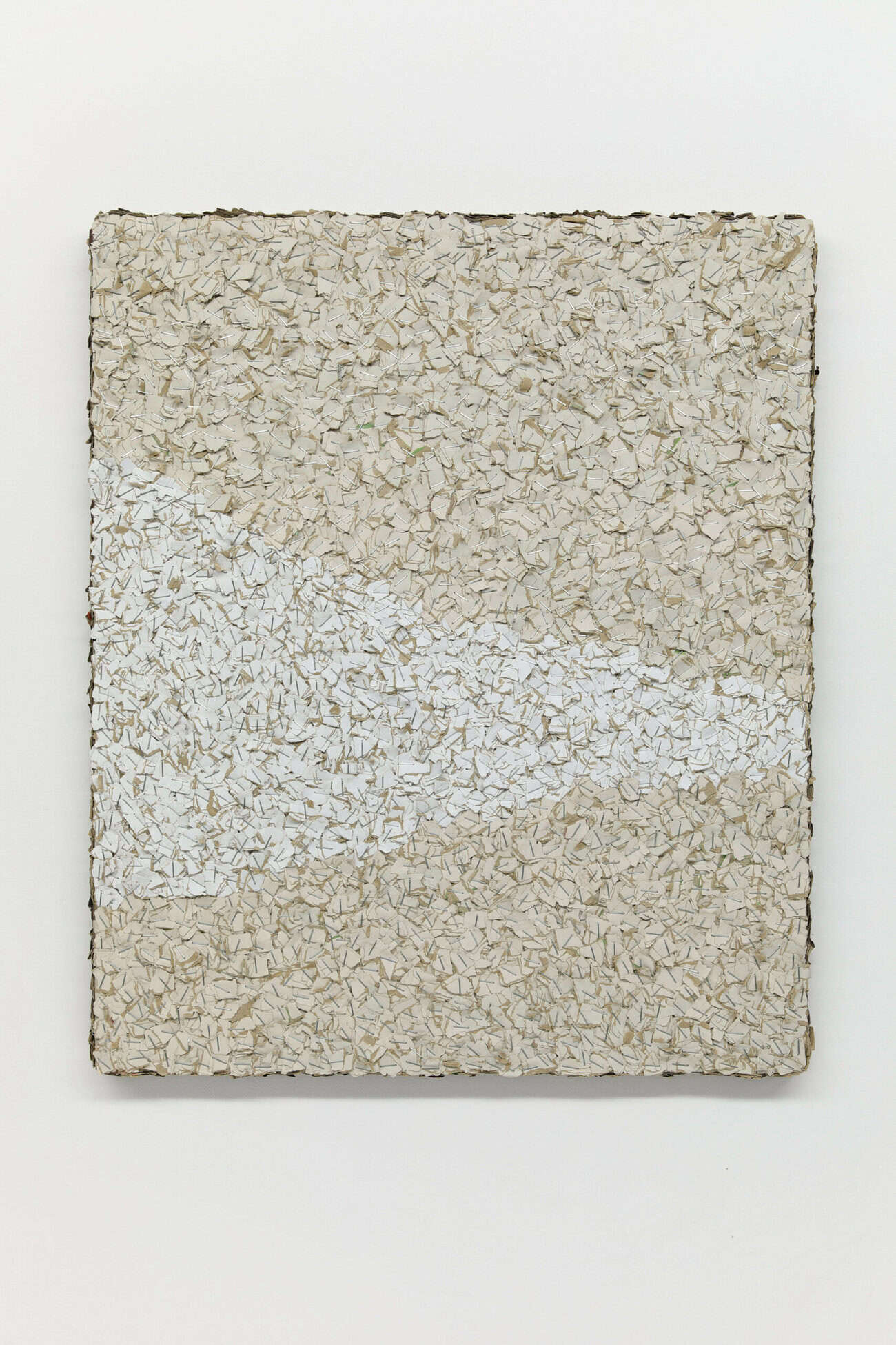 Guillermo Mora est un artiste espagnol basé à Madrid. Sa série murale « Si Pero No » est composée de feuilles de papier agrafées puis arrachées. Les feuilles colorées sont fixées directement sur le mur par plusieurs centaines d’agrafes, créant un aplat monochrome que l’artiste va irrévérencieusement déconstruire. Les feuilles colorées sont fixées directement sur le mur par plusieurs centaines d’agrafes, créant un aplat monochrome que l’artiste va irrévérencieusement déconstruire. Les oeuvres 1000 Puntos de Luz y Sombra (A Seurat) suivent le même processus de déconstruction du papier, accumulé et fixé à un support en bois à l’aide d’agrafes. La superposition de fragments rappelle les coups de pinceaux de certaines compositions pointillistes, évoquant également une déconstruction du paysage.