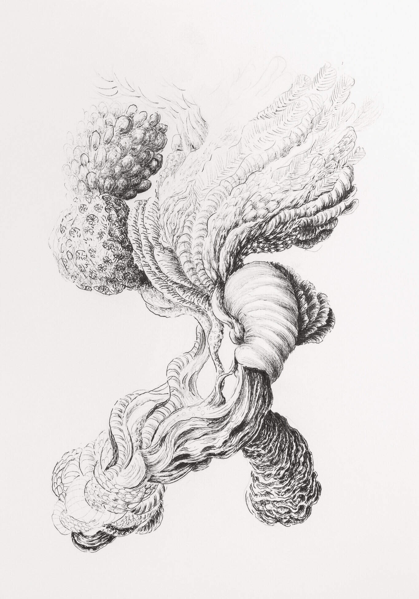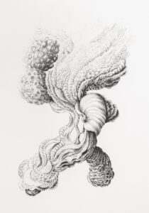 Les dessins, hybrides et multiformes, évoquent des agrégats de « matière » qui font monde et système, en écho avec les formes du monde naturel, du vivant et du minéral. Ces compositions énigmatiques donnent naissance à des organismes imaginaires dont la logique formelle interroge notre perception du naturel et de l’artificiel.
