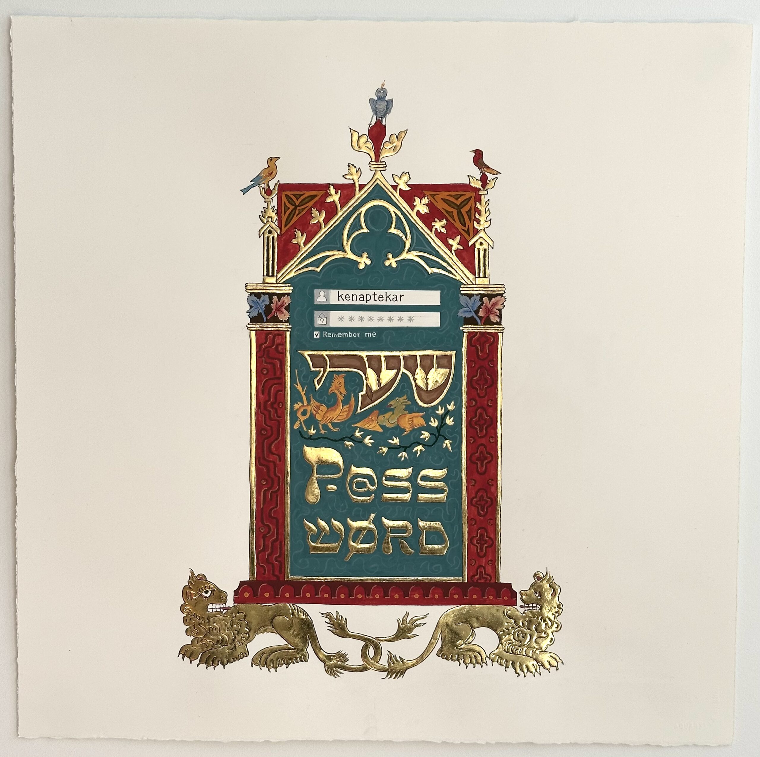 La série "Illuminated Manuscripts in the Age of Social Media and Texting" de Ken Aptekar prend forme en 2020 durant le confinement qu'il traverse en Bourgogne. L’artiste y réactive la tradition de l’enluminure médiévale — lettrines peintes, marges structurées, motifs ornementaux, feuilles d’or et d’argent — non par nostalgie, mais comme un dispositif critique. À cette grammaire ancienne s’adossent les signes les plus instables de notre présent : notifications, fragments de messagerie instantanée, réseaux sociaux, typographies numériques. La confrontation met en tension deux régimes d’attention : la lenteur attentive du manuscrit et la vitesse réactionnelle des flux digitaux.