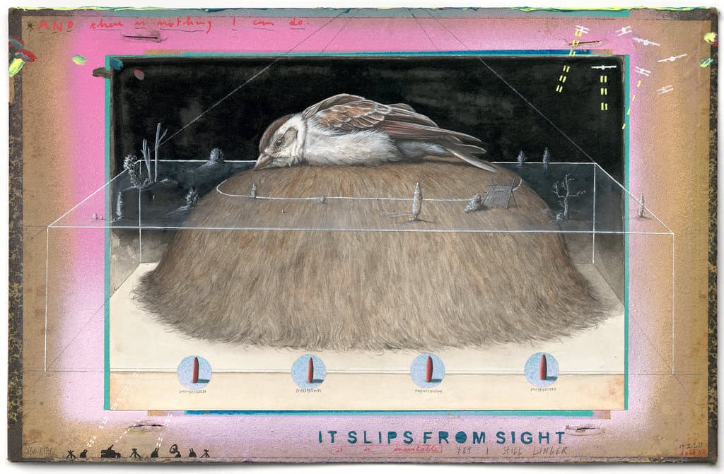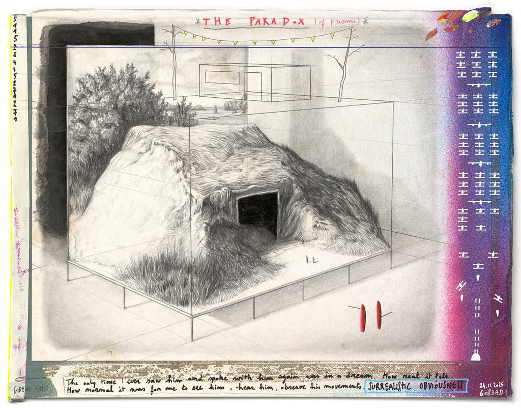 L'artiste joue habilement avec les caractéristiques stylistiques de l'architecture et du langage spatial, qu'il condense dans un genre artificiel. Bien que Simon Schubert tapisse parfois des pièces entières de papier, dans lesquelles de mystérieuses créatures de plumes sculpturales se livrent à des actions prétendument cultuelles et des enfants sans visage se perdent dans des jeux énigmatiques, le monde parallèle, qui rappelle par sa surréalité les scènes cinématographiques de David Lynch, n'est que partiellement accessible. Le visiteur, envoûté, pénètre dans l'architecture fascinante qui, cependant, lui impose toujours de nouvelles barrières à l'intérieur, car chaque fois qu'il regarde l'œuvre, de nouveaux chemins s'ouvrent visuellement, mais restent physiquement fermés. Petit à petit, l'artiste attire le destinataire dans un monde qui, à un certain moment, commence à se retirer de l'espace vers la surface, jusqu'à ce que le chemin puisse finalement être achevé comme un acte mental de l'imagination individuelle.