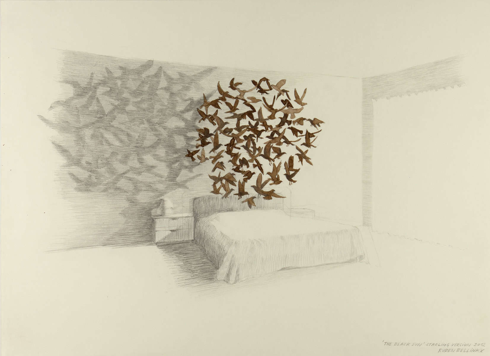 Black Sun is a project Ruben Bellinkx (1975) realized in 2022, based on earlier drawings and watercolours that resulted in a film for which he built a live size bedroom. It consits of two versions in which we see two kinds of strange intruders visit the same room. The first projection captures a flock of birds that, having left their natural habitat, enter a sterile bedroom. In the second projection, we see a swarm of drones occupy the same room. The softer lighting tells us that it’s a different time of day to the other visit. But just like the birds, these unmanned aerial devices also explore the bedroom.