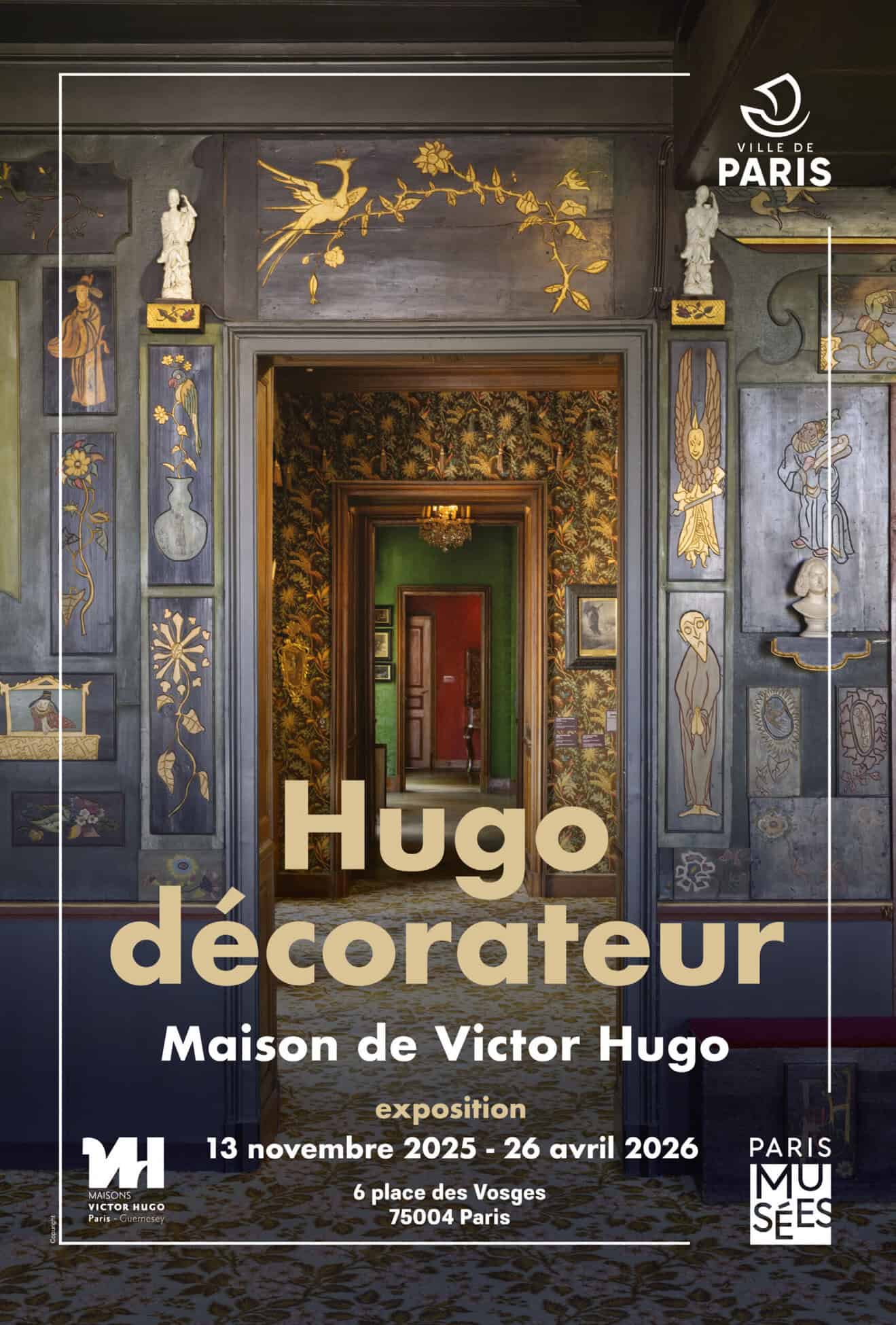 L’exposition Hugo décorateur, la maison de Victor Hugo dévoile une facette méconnue mais néanmoins fascinante de la créativité de l’artiste : celle de décorateur. L’exposition explore l’univers décoratif de l’artiste, entre imagination graphique, obsession de l’objet et invention de l’espace comme œuvre totale. De ses intérieurs parisiens à la fabuleuse Hauteville House, le visiteur découvre la façon dont Victor Hugo pensait le décor comme une extension de son esprit et de sa poésie, créant des ambiances foisonnantes où murs, sols et plafonds deviennent supports de création.
